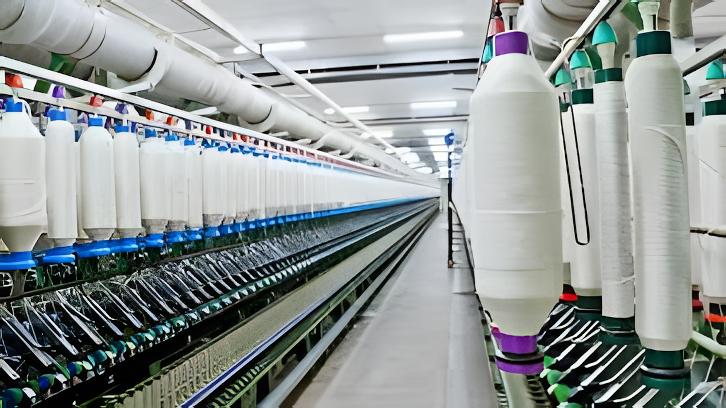IoT sensors on spinning machines feed data into AI analytics. The system predicts potential breakdowns, allowing preventive maintenance.